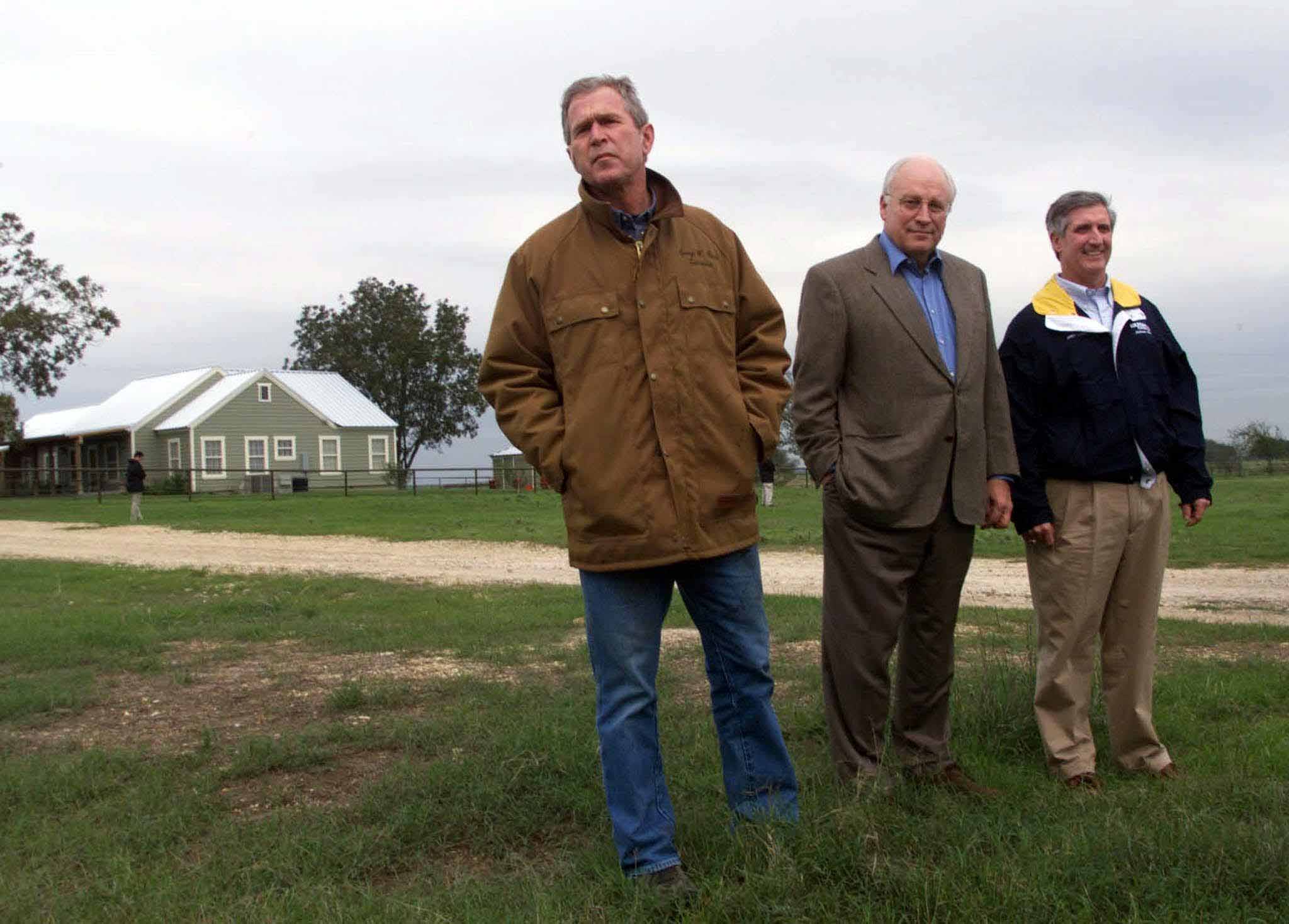 | CRAWFORD Republikeins presidentskandidaat George W. Bush, diens kandidaat voor het vice-presidentschap Dick Cheney (m.) en een adviseur (r.) beantwoorden op de ranch van Bush in Crawford, Texas, vragen van verslaggevers. Democratisch kandidaat Al Gore heeft zelf nog niets van zich laten horen.