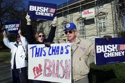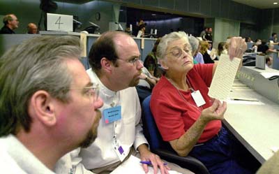 | WEST PALM BEACH In een van de stembureaus in het kiesdistrict West Palm Beach gaan officials onverdroten door met het hertellen van de stemmen. Of hun werk zin heeft, zal blijken wanneer het hooggerechtshof van Florida vanmiddag of vanavond uitspraak heeft gedaan. De Republikeinse presidentskandidaat George W. Bush (midden) zag zaterdag na het tellen van de poststemmen zijn voorsprong in de betwiste staat op zijn Democratische rivaal Al Gore verdrievoudigen. Bij zijn gouverneurswoning in de hoofdstad van Texas, Austin, wuift Bush naar aanhangers. Tegenstanders van Gore laten bij diens ambtswoning in Washington weten niet gecharmeerd te zijn van het gerommel rond het vaststellen van de uitslag (onder).
