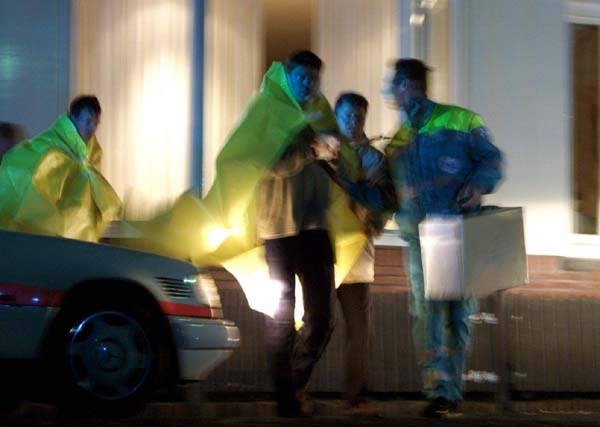 VOLENDAM Een van de slachtoffers van de brand in Het Hemeltje wordt op een brandcard afgevoerd.