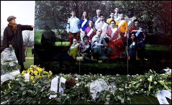 | VLAARDINGEN In Vlaardingen is gisteren het monument Boeket van jongeren onthuld. Bij het monument wil de gemeente Vlaardingen elk jaar een herdenking organiseren voor slachtoffers van zinloos geweld. Het kunstwerk met een collage van foto's van jongeren staat tegenover NS-station Vlaardingen-Oost, de plaats waar de 17-jarige student Daniel van Cotthem op 7 januari 2000 klappen van een groepje jongeren kreeg. Twee dagen later overleed hij aan de gevolgen.