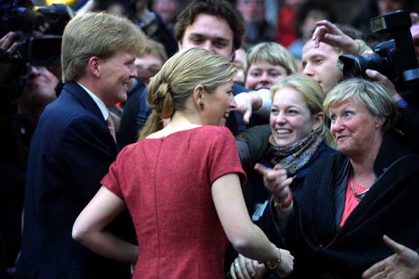 DEN HAAG Enthousiast begroeten tallozen in Den Haag het verloofde stel. Dank u wel, zegt Máxima doorlopend.