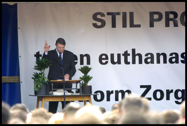 DEN HAAG SGP-leider Van der Vlies wijst tijdens zijn toespraak op het belang van het gebed.