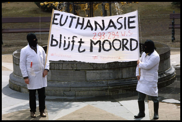 DEN HAAG Op het Binnenhof stonden twee rooms-katholieke actievoerders met dreigende spuiten. De organisatoren van het Platform voor het Leven waren niet blij met deze vorm van protest.
