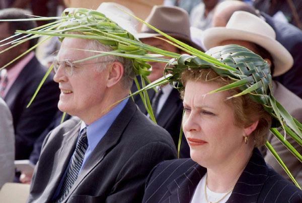 | NOUMEA De Franse premier Lionel Jospin (l) en de cultuurminister Catherine Trautmann dragen traditionele strohoeden in Noumea, Nieuw-Caledonië. Jospin is op tweedaags bezoek om een overeenkomst te ondertekenen dat de onafhankelijkheid van het mineraalrijke Nieuw-Caledonië in het Middellandse Zeegebied tot gevolg kan hebben.