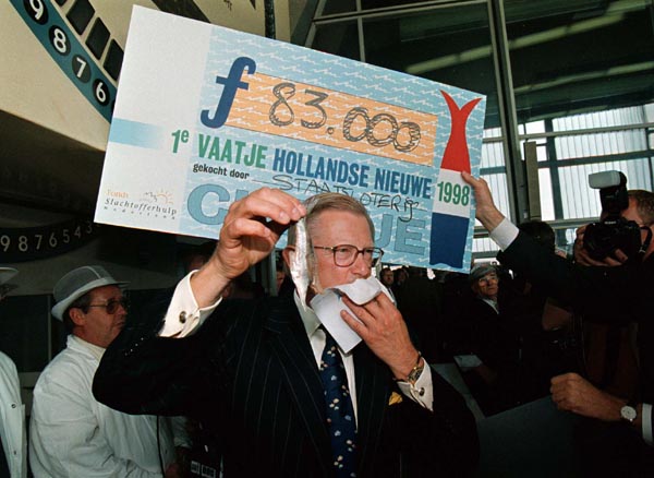 | SCHEVENINGEN Pieter van Vollenhoven, voorzitter van het Fonds Slachtofferhulp, laat zich de haring goed smaken. Hij was gisteren in Scheveningen aanwezig bij de veiling van de eerste nieuwe haring. De Staatsloterij kocht het eerste vaatje voor 83.000 gulden. De opbrengst is bestemd voor het Fonds Slachtofferhulp.