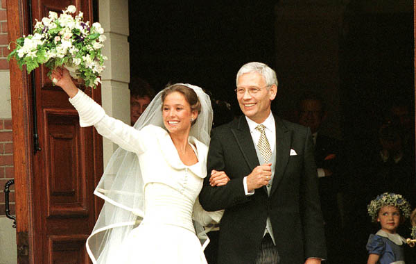 Een stralende Marilène groet het Apeldoornse publiek voor zij aan de arm van haar vader, EU-commissaris Van den Broek, de kerk binnen gaat.