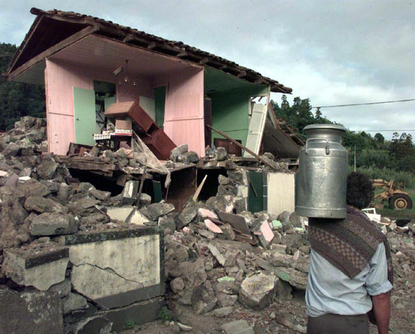 FAIAL, Azoren Een boer loopt langs een verwoest huis, een van de vele die de aardbeving van afgelopen donderdag niet doorstonden.