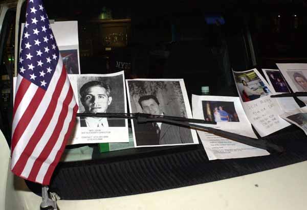 NEW YORK Foto's van vermiste mensen onder de ruitenwissers van een vrachtauto bij het Bellevue Hospital, waar veel mensen wachten in de hoop familie en bekenden terug te vinden.