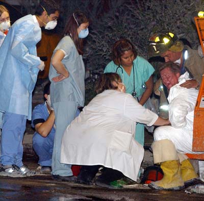 NEW YORK Medisch personeel hielp vanmorgen (Nederlandse tijd) een reddingswerker bij het WTC.