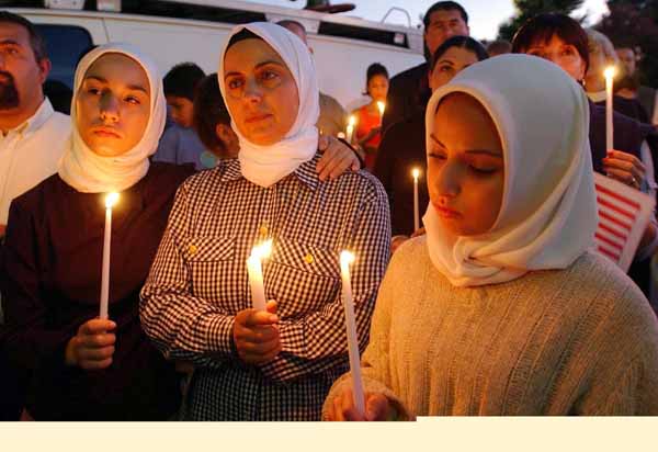 PASADENA Amerikaanse moslims in Pasadena, Californië tijdens een herdenkingsdienst die gisteravond gehouden werd voor de slachtoffers van de aanslagen.