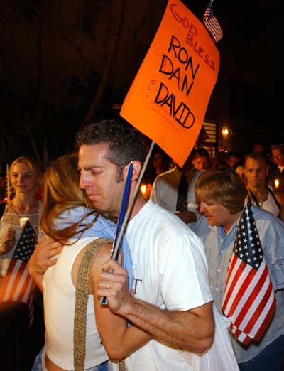 ![]() | WEST HOLLYWOOD Dan Levy omarmt een vriendin tijdens een herdenkingsceremonie gisteravond in West-Hollywood, Californië. Hij houdt een bord in de lucht met de namen van zijn drie vermiste vrienden. Meer dan 1000 mensen woonden de bijeenkomst bij.