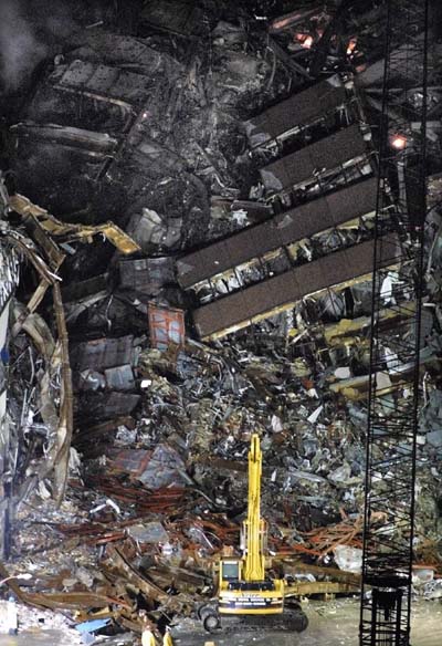 NEW YORK Een shovel die wordt gebruikt bij de reddingswerkzaamheden in New York, valt in het niet bij de berg puin van het World Trade Center.