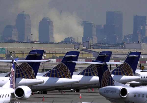 | NEWARK Terwijl tegen de achtergrond rookwolken opstijgen van de verwoeste gebouwen van het World Trade Center in New York, staan vliegtuigen van de maatschappij Continental op de luchthaven Newark, New Jersey, werkeloos aan de grond. De Verenigde Staten willen tot nader order slechts internationale vluchten toelaten van Amerikaanse luchtvaartmaatschappijen.
