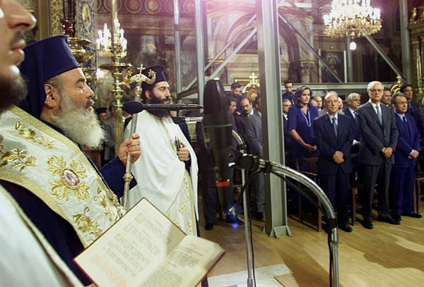 | ATHENE De Griekse minister-president Costas Simitis (derde van rechts), Griekse politici en ambassadeurs wonen een speciale herdenkingsdienst bij, geleid door de aartsbisschop van Griekenland, voor de slachtoffers van de terroristische aanslagen in de VS.