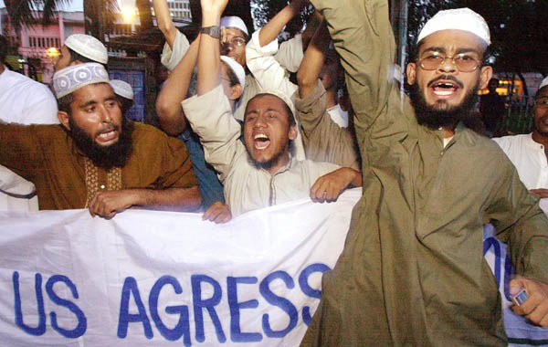 | BANGLADESH Een groep Moslimfundamentalisten uit Bangladesh schreeuwt anti-Amerikaanse slogans tijdens een demonstratie in Dhaka, Bangladesh. De demonstratie vond vandaag plaats uit protest tegen vermeende Amerikaanse vergeldingsactie tegen Afghanistan. Meer dan honderd islamieten schreeuwden om een heilige oorlog en verbrandden de Amerikaanse vlag.