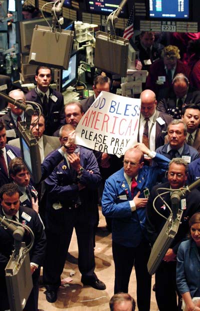 | CHICAGO Wall Street en de schermenbeurs Nasdaq gingen gisteren voor het eerst na de aanslagen vorige week weer open. De spanning was groot. Op de foto geeft een handelaar in Chicago een duidelijk signaal voor een deal op de Nasdaq-beurs.