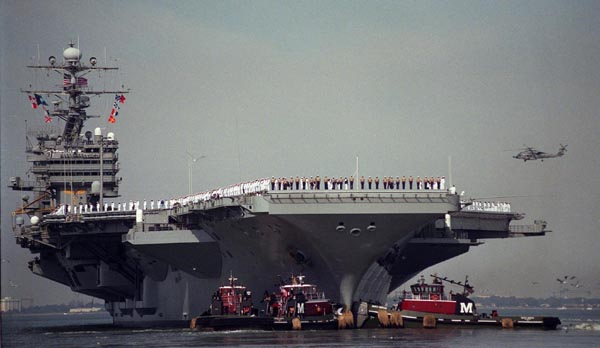 | NORFOLK Het Amerikaanse vliegdekschip USS Theodore Roosevelt vertrok gisteren uit de haven van Norfolk. Het schip en de veertien bijbehorende oorlogsschepen (met in totaal 2000 mariniers aan boord) werden bij hun vertrek vanuit de lucht in de gaten gehouden door talloze helikopters. De Theodore Roosevelt heeft de Middellandse Zee als voorlopige eindbestemming.