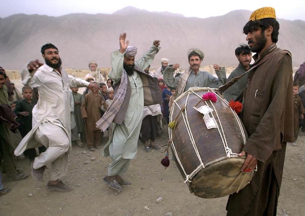 | QUETTA Afghaanse vluchtelingen in een kamp bij het Pakistaanse Quetta, gelegen in de buurt van de Afghaanse grens, dansten gisteren op traditionele muziek. Volgens recente tellingen zijn de afgelopen dagen ten minste 15.000 Afghanen naar Pakistan gevlucht uit zorg over mogelijke Amerikaanse aanvallen op hun land.
