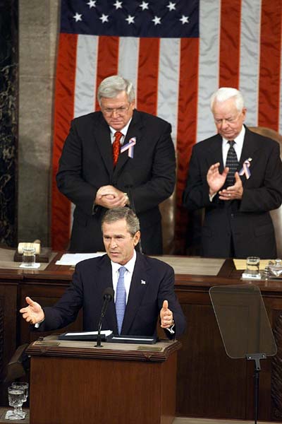 WASHINGTON President George W. Bush heeft vannacht (Nederlandse tijd) het Amerikaanse Congres toegesproken. De toespraak, die bijna drie kwartier duurde, werd maar liefst 31 keer onderbroken door langdurig applaus.