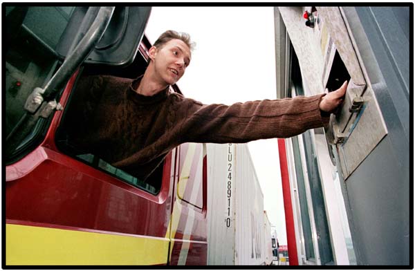| Een chauffeur van een vrachtwagencombinatie identificeert zich bij de toegangspoort van de containerterminal ECT in Rotterdam. Hij plaatst zijn hand in een machine die een driedimensionale scan maakt. De computer weet vervolgens wat er in de vrachtwagen zit, drukt een routebeschrijving en verkort de wachttijden van de chauffeur met 50 tot 70 procent.