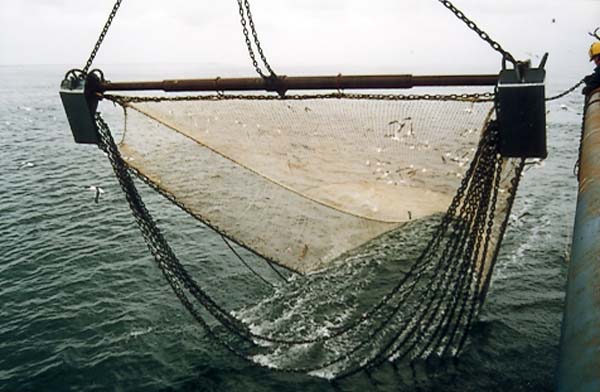 Het onderzoekschip Tridens haalt een boomkor boven water. Onder de boom hangt een reeks kettingen die de zeebodem omwoelen om de platvis op te schrikken en het net in te jagen.