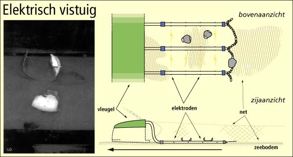 | Aan de voorkant van het elektrisch vistuig slepen linten over de zeebodem. Elektroden aan de zijkant van de linten veroorzaken een kortdurende stroompuls, waardoor de platvis als een rolmops opkrult en door het net wordt opgeschept. Ook tong, een vissoort die zich diep in het zand ingraaft, reageert op het elektrisch veld.
