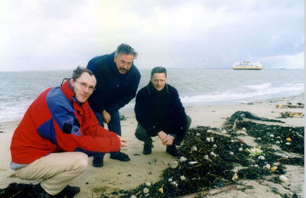 Gebiologeerd door de zee, maar vanuit verschillende invalshoeken (v.l.n.r.): dr. A. D. Rijnsdorp van het RIVO, dr. H. J. Lindeboom van het NIOZ en G. Meun van vissersorganisatie PO Oost.