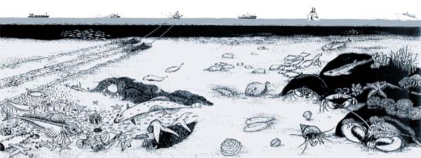 | De zeebodem zoals het Nederlands Instituut voor Onderzoek der Zee (NIOZ) die het liefst zou zien. Links een gebied dat intensief bevist wordt, waarin vooral platvis, (beschadigde) zeesterren en wormen voorkomen; rechts een voor de bodemvisserij gesloten gebied met een grote biodiversiteit: zee-egels, zeeanemonen, pareloesters, wulken en heremietkreeften kunnen daar voorkomen. Het Nederlands Instituut voor Visserijonderzoek RIVO en de vissers denken dat zulke gesloten gebieden niet nodig zijn.