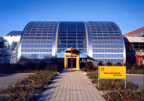 | Grote oliemaatschappijen zoals Shell en BP begeven zich op de zonne-energiemarkt. Dat toont aan dat die ondernemingen er bij voorbaat niet van uitgaan dat gas en aardolie de toekomst hebben. Shell besteedt in de periode 1997 tot en met 2005 1 miljard gulden aan duurzame energie. Op de foto de zonnecelfabriek van Shell Solar in het Duitse Gelsenkirchen. Deze grootste fabriek op dit gebied in Europa moet een productiecapaciteit van 25 megawatt per jaar krijgen.