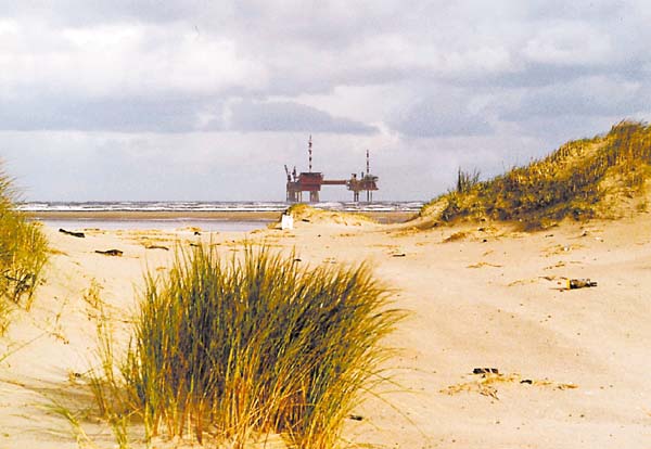 Het gaswinplatform Ameland-Westgat (AWG) op weg naar locatie. Met de AWG wordt al sinds 1986 waddengas gewonnen.