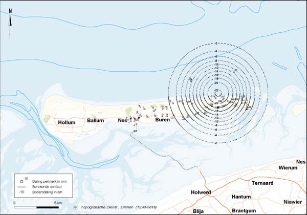 Bodemdaling Ameland. De situatie in 1999, op basis van metingen. De cirkels duiden de verschillende hoogtelijnen aan. Het midden van de schotel is 22 centimeter diep.