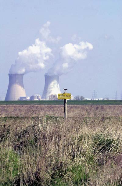 Natuurgebied. De tureluur op het paaltje heeft uitzicht op twee immense koeltorens van een Belgische kerncentrale, vlak bij het Verdronken Land van Saeftinghe.