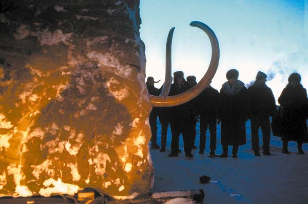 Bijna drie weken later brengt de helikopter de kolos naar de havenstad Chatanga. Het team poseert nog een keer bij het ijsblok.