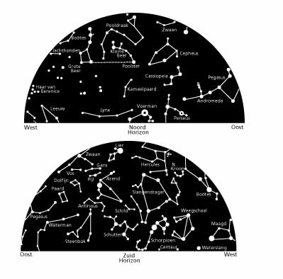 De sterrenhemel zoals die er omstreeks 15 juni kort na middernacht uitziet.