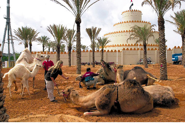 Dit is geen oase ergens in de woestijn, maar in de nabijheid van het paviljoen van de Verenigde Arabische Emiraten op de Expo 2000. Dromedarissen rusten uit tussen palmbomen.