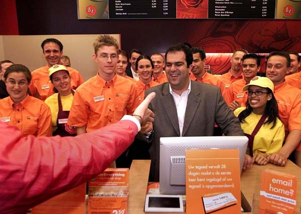 Met een brede grijns overhandigt de Griekse eigenaar Stelios Haji-Ioannou het eerste entreekaartje van zijn internetcafé aan een Spaanse bezoeker.