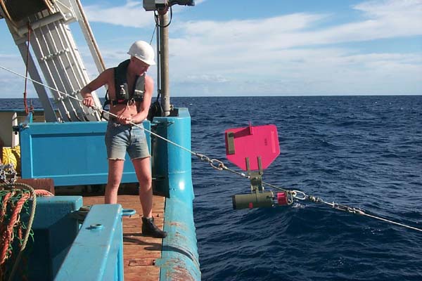 | Een onderzoeker aan boord van de Pelagia plaatst een stroommeter in zee. De meter zit op een bepaalde hoogte aan een kabel die is verankerd aan de zeebodem. Het roer aan de bovenkant zorgt ervoor dat de propeller altijd in de richting van de stroming wijst. Het aantal omwentelingen van de propeller is een maat voor de stroomsnelheid.