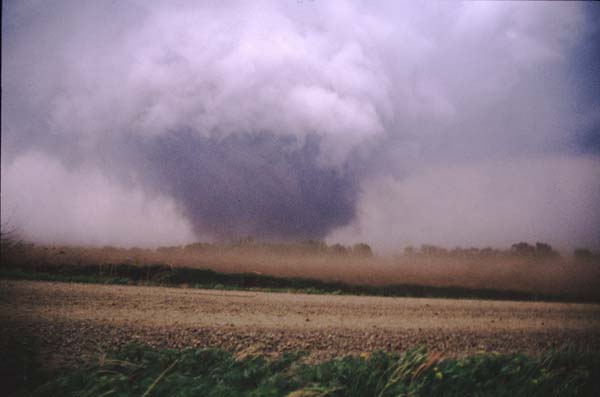 | De tornado is nu in een volwassen stadium. Op de voorgrond is te zien dat het zand op de akkers 5 tot 10 meter hoog wordt opgezogen. Op de achtergrond is de zwarte, ronddraaiende wolk aan de grond duidelijk te zien. Bovenaan is de tornado wit.