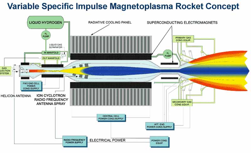 De plasmamotor bestaat uit drie aaneengeschakelde magneetruimtes waarin een gas sterk wordt verhit met behulp van supergeleidende elektromagneten.