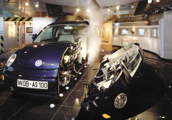 Volkswagen presenteert in een nieuw attractiepark in het Duitse Wolfsburg haar manier van werken. Autostadt levert veel hightech zoals deze doorgezaagde New Beetle maar is ook voor kinderen aantrekkelijk.
