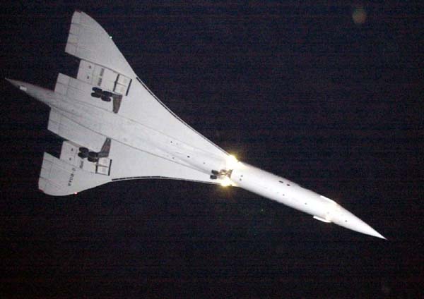 Met de landingslichten aan nadert deze Concorde van British Airways de thuisbasis Londen. De bemanning moest zonder passagiers terugkomen uit New York nadat ook de Britse rijksluchtvaartdienst besloot alle Concordes aan de grond te houden.