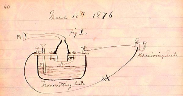 De schets die Bell maakte van zijn eerste telefoon. Links het mondstuk, rechts de ontvanger.