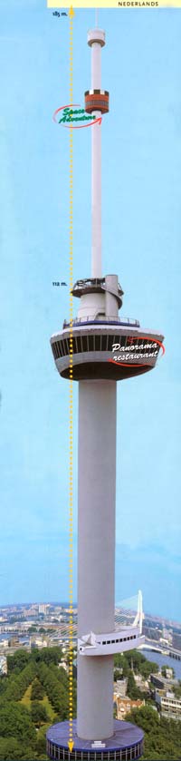 Euromast hangt vol sproeiersDoor J. Visscher Wat een helder weer. Prachtig. Je kunt de Noordzee zien. Op 100 meter hoogte, boven het panoramarestaurant van de Euromast, laat Frans Biemans zijn blik over Rotterdam gaan. Bruggen, havens, kantoorkolossen, slierten auto's markeren de Maasstad. Het uitzicht verveelt nooit, zegt de manager van de Euromast. Straks, eind september, krijg je 's avonds die mooie rode luchten boven de stad. Formidabel. Stel dat er brand uitbreekt, terwijl honderden toeristen in het panoramarestaurant op 96 meter hoogte verblijven? Je houdt er rekening mee, zegt Biemans, ook verantwoordelijk voor de veiligheid in de Euromast, die jaarlijks zo'n 250.000 buitenlandse toeristen trekt. De paniek die er misschien uit zou breken, is m'n grootste angst. Sproeiers De sprinklerinstallatie haalt het water uit twee bronnen. In een vat boven het restaurant (zie de afbeelding hiernaast) ligt 40.000 liter water opgeslagen. Dat hoef je alleen maar naar beneden te laten lopen, lacht Biemans. Binnen 20 minuten is die voorraad bluswater echter uitgeput. Daarom is de sprinklerinstallatie ook aangesloten op de hoofdwaterleiding. Pompen stuwen het water naar boven, de installatie in. Muziek Bij brand is gebruik van liften voor het publiek verboden. Mensen moeten vluchten via de noodtrap. Die moet 60 minuten brandwerend zijn. Onze trap is zo gemaakt dat je lekker snel naar beneden loopt, zegt Biemans, terwijl we in de holle buis de betonnen trap afdalen. Behalve voor dames met hoge hakken. Ooit is de noodtrap in de Euromast in gebruik geweest. De beide liften weigerden dienst. Het is zaak dat het publiek bij een calamiteit zo snel mogelijk wordt gealarmeerd. In de Euromast is de noodzender aangesloten op de radio. Beneden bij de kassa's draait Biemans een schakelaar om. Er klinkt muziek uit een speaker. Deze muziek draaien ze op dit moment in het panoramarestaurant. Bij een brand wordt die muziek onmiddellijk onderbroken en volgt de alarmmelding. Automatisch met een goed verstaanbaar volume. De Euromast heeft twee liften, waarvan één gebruikt kan worden als brandweerlift. Die heeft brandwerende bekabeling. De Euromast is het enige object in Nederland waar de twee liften in één schacht zitten, weet Biemans. Mocht er één lift kapot zijn, dan kunnen de passagiers gebruik maken van de andere. Z'n maatje gaat dan naast 'm staan en de mensen kunnen overstappen. Als je de kapotte lift met de hand naar beneden zou moeten halen, draai je je wezenloos. Nadeel is dat het systeem niet zonder gevaar is. Reparateurs moeten oppassen. Ze moeten hun hoofd niet buiten de lift steken, want de andere lift kan eraan komen. Manco Fors manco bij veel hoge gebouwen is het ontbreken van een sprinklerinstallatie, betoogt Hagen. Ik denk bijvoorbeeld aan een hoog woongebouw in Scheveningen. Daar is geen sprinklerinstallatie. Nederland loopt wat dat betreft ver achter bij Amerika. Daar is een sprinklerinstallatie gemeengoed. Onlangs had ik wat Amerikanen op bezoek. Ze weigerden in Amsterdam te gaan slapen in een ongesprinkeld hotel. Ik heb een tijd moeten zoeken om een geschikte locatie te vinden. Uit internationaal onderzoek blijkt dat een sprinklerinstallatie in 98 procent van de gevallen een brand in de kiem smoort. Dat er in menig Nederlands hoog gebouw toch niet zo'n sproei-installatie is te vinden, heeft te maken met de centen, betoogt Hagen. Ik weet dat er vaak harde onderhandelingen worden gevoerd tussen de brandweer en de aannemer. Een sprinklerinstallatie kan honderdduizenden guldens kosten. De bouwer probeert de kosten te drukken. Die redeneert: In mijn gebouw komt geen brand. Hagen pleit voor dubbele brandweerliften in hoge gebouwen. Dan kunnen de brandweerlieden heel wat sneller hun spullen naar boven krijgen. Ook een overdrukinstallatie, die rook wegblaast, kan gouden diensten bewijzen, aldus Hagen. |