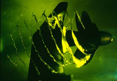 | Deze twee foto's van schroeven laten het proces van cavitatie zien. Bij de bovenste foto ontstaan gasbellen aan de voorrand van het propellerblad vanwege de zuigende werking ervan. Draait de schroef harder, dan ontstaat een gasbel die het hele oppervlak van de propellerbladen kan bedekken.