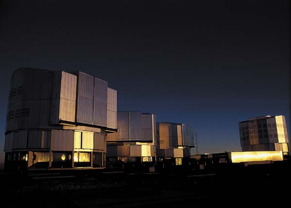 Een lage zomerzon strijkt over de Cerro Paranal. Op die Chileense bergtop bouwden Europese astronomen de afgelopen jaren de krachtigste telescopen die de sterrenkundige wereld tot nu toe tot haar beschikking heeft.