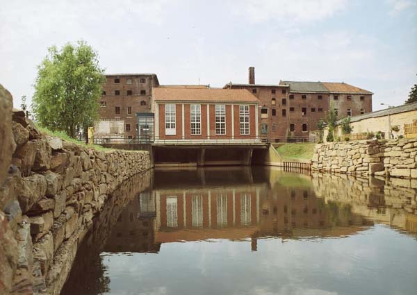 | Het industrieel rijksmonument de ECI-centrale in Roermond draait, na 26 jaar stilstand, sinds vrijdag weer. Exploitant Nuon bouwde tegen de waterkrachtcentrale uit 1920 een moderne waterkrachteenheid aan. De 2.200.000 kilowattuur die de centrale jaarlijks gaat leveren, is voldoende voor 700 huishoudens. Links en rechts op de foto de door het waterschap Roer en Overmaas grondig gerestaureerde oevers van de watergang.