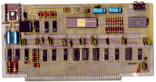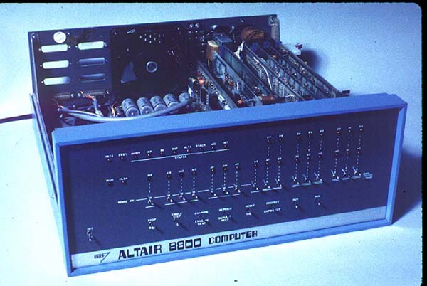 | Het 'toetsenbord' van de Altair 8800 bestaat uit de rij schakelaars aan de voorkant, het 'beeldscherm' uit de rij rode lampjes. De Altair is een van de allereerste bureaucomputers. De onderste foto laat de printplaat van de Altair zien. De processor op de plaat heeft een kloksnelheid van 2 MHz. Voor deze machine schreven Bill Gates en Paul Allen in 1975 de computertaal Basic. Dat markeerde het begin van Microsoft. |