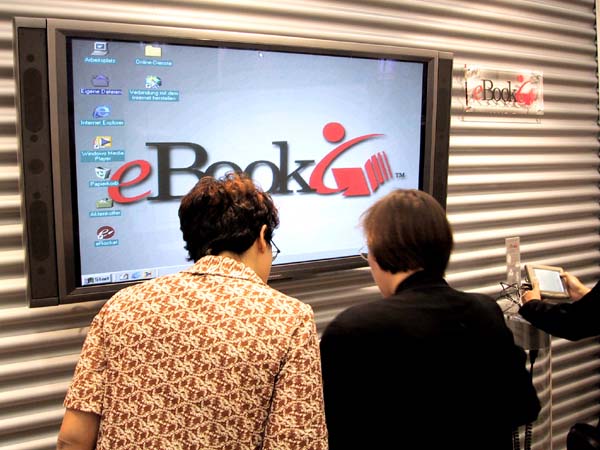 Bezoekers van de Frankfurter Buchmesse bewonderen de elektronische tegenhanger van het papieren boek, het e-book.