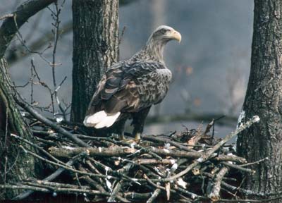 Een zeearend op zijn nest. Deze standvogel, die alleen bij voedselgebrek zijn broedgebied verlaat, is te herkennen aan zijn omvang, zijn korte witte staart en zijn gigantische gele snavel.
