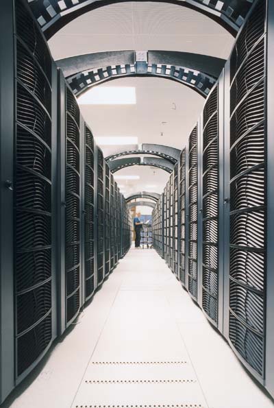 ![]() | Amsterdam heeft voorlopig de snelste computer van Europa. In de 'windtunnel' tussen de twee rijen computerkasten waait het stevig, om de machine goed te kunnen koelen. De overbrugging tussen de rijen dient voor de communicatie tussen de verschillende delen van de computer.